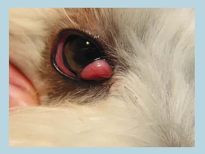 - Er is eerst een ontsteking in het oog aanwezig geweest, die de traanklier heeft vergroot, waarna het derde ooglid de druk niet meer kan weerstaan en omslaat.
