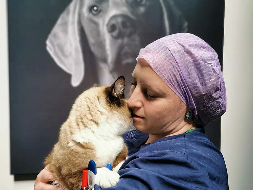Dinsdag – ik rijd ’s ochtends eerst langs de apotheek om medicatie op te halen voor de kliniek en ga gelijk even naar de supermarkt om wat fruit voor mijn collega’s te halen. Zodra ik bij de kliniek aankom word ik gevraagd door Europees specialist interne geneeskunde, Ronald van Noort om te helpen met een angstig katje. Ik ben een van de “kattenfluisteraars” in de kliniek en word regelmatig gevraagd om bij katjes te komen helpen. Dit poesje vindt het bezoekje erg spannend en de arts wil graag bloed afnemen. Met een beetje liefde en geduld gaat het gelukkig prima en hebben we al snel wat bloed om op te sturen naar het laboratorium.