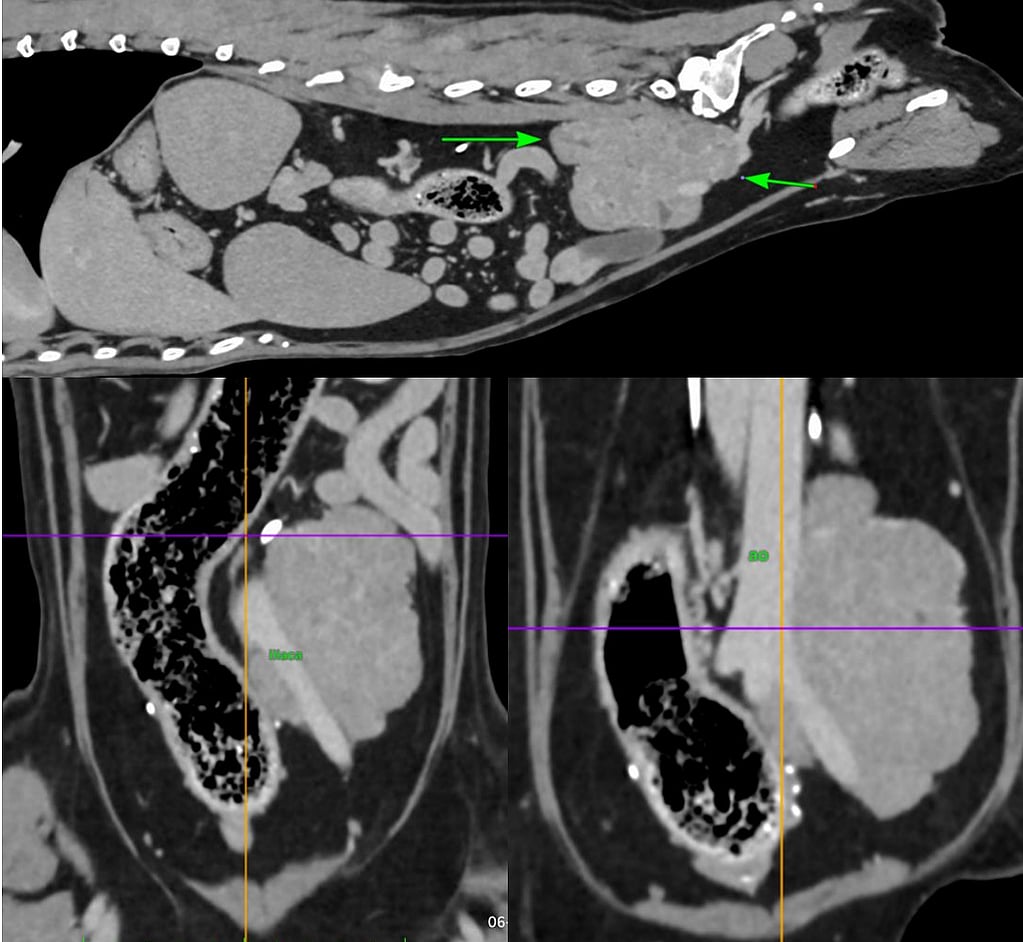 Elke 3 maanden kwam Kyra op oncologie controle. Begin januari 2025 kwam ze i.v.m. blaasproblemen. Bij het echografisch onderzoek door onze Europees Specialist Radiologie Susanne Boroffka werd er een enorm grote massa ontdekt achter in de buik. Dit bleek een sterk vergrootte lymfeklier te zijn. Uit de punctie bleek dat het ging om een uitzaaiing van de anaalzaktumor die 3 jaar eerder was verwijderd. Ook maakte deze tumor een hormoon dat zorgde voor te veel calcium in het bloed.
