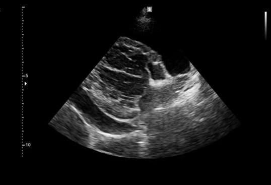 De echo thorax gemaakt door onze specialist diagnostische beeldvorming Susanne Boroffka, liet ernstige pericard overvulling zien met compressie van het rechter atrium. Geen duidelijke tumor zichtbaar maar kan dat helaas niet uitgesloten worden.