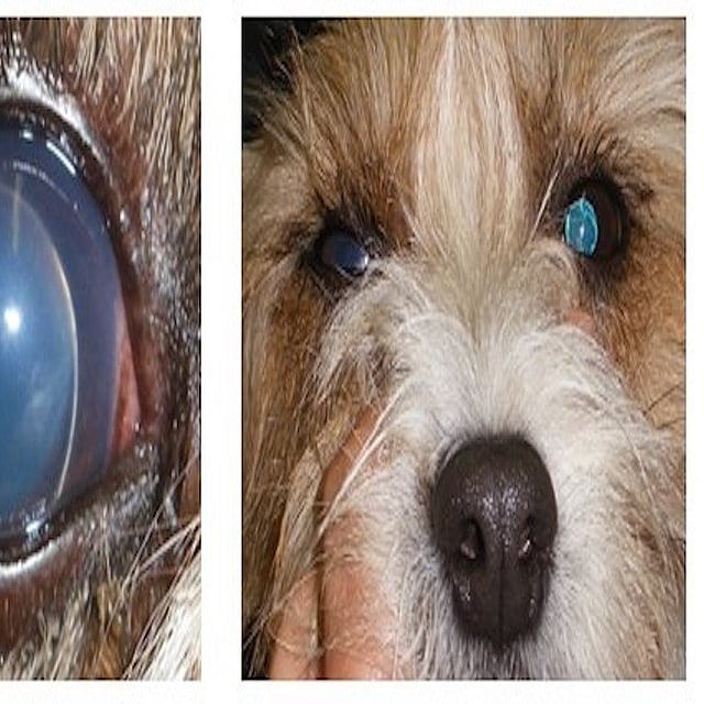 - Franky (dog4): Mixed breed, Male neutered, 8 years old – Sudden onset pain right eye (OD).