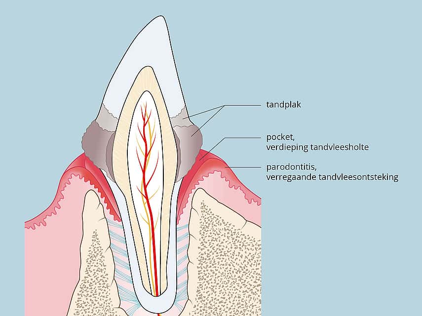 Nadat zich pockets (opening tussen tandvlees en de tand) gevormd hebben aan de rand van het tandvlees, kan de ontsteking van het tandvlees de diepte ingaan en het steunweefsel van de tanden en kiezen aantasten.