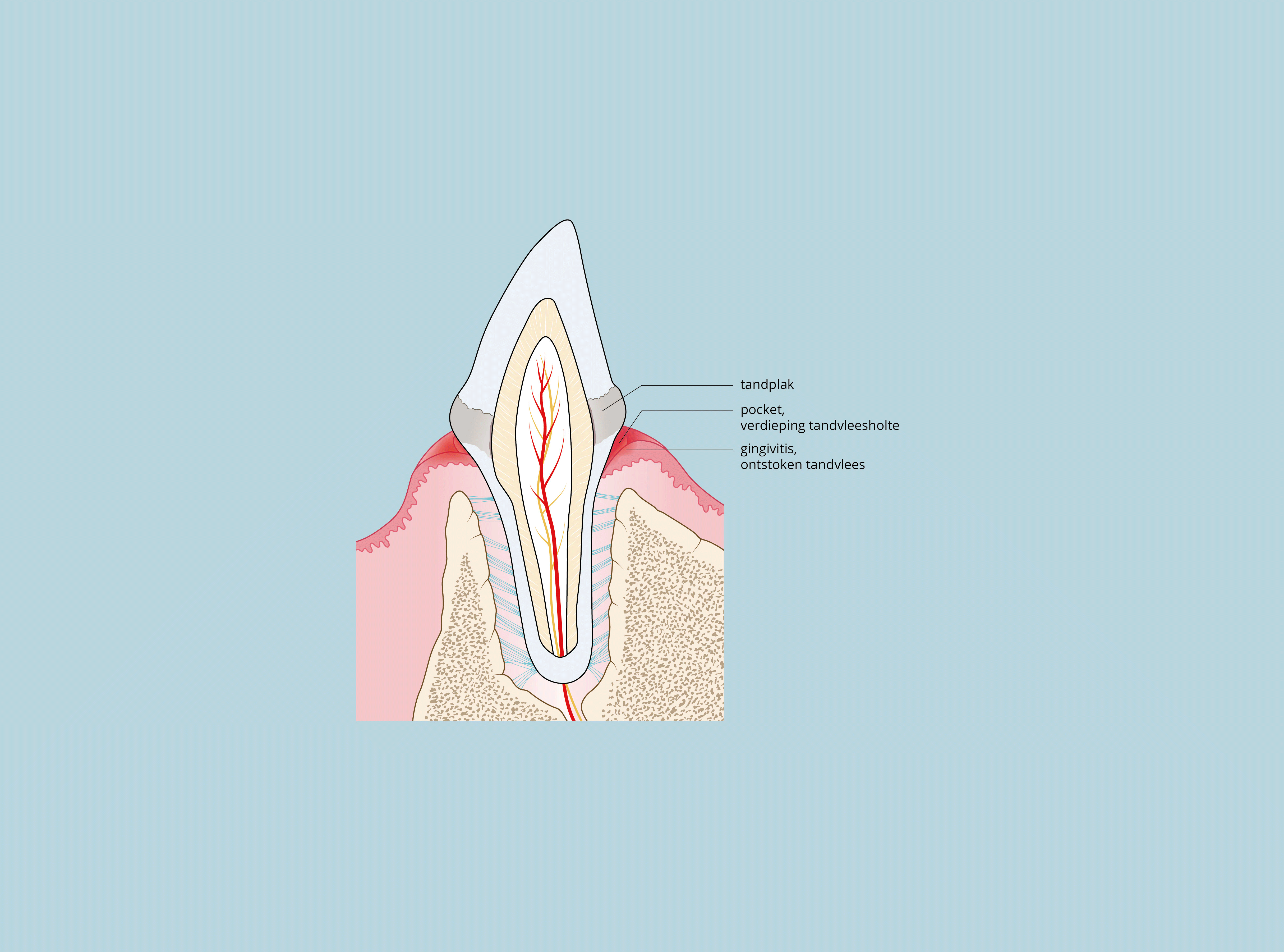 Als gingivitis niet behandeld wordt ontstaat door de zwelling van het tandvlees een opening tussen de tand en het tandvlees (pocket). Bacteriën nestelen zich dus onder de rand van het tandvlees en maken het steunweefsel kapot. Dit stadium noemen we parodontitis. De ontsteking gaat steeds verder de diepte in.