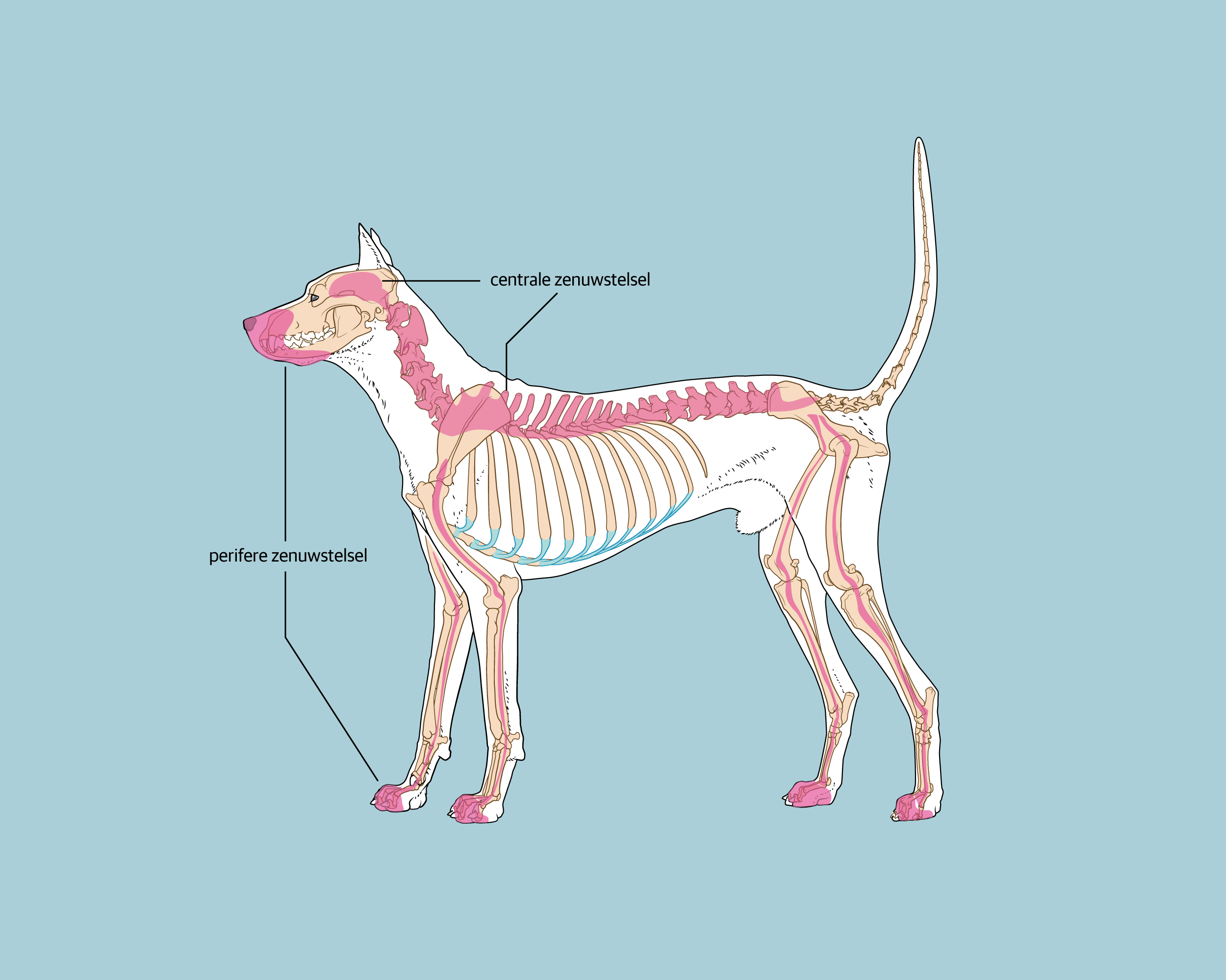 - Het centrale zenuwstelsel: de hersenen en het ruggenmerg van de hond.